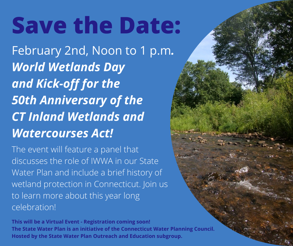 A public webinar that will feature a panel that discusses the role of the Inland Wetland and Watercourses Act in the State Water Plan and include a brief history of wetland protection in Connecticut.
